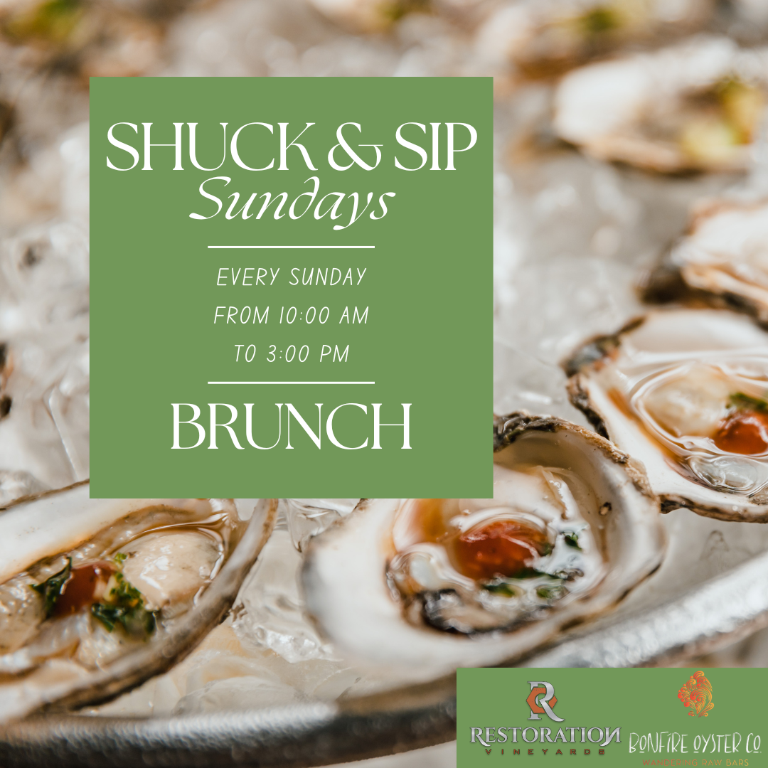 Join us Sunday, September 21st for our Shuck & Sip celebration to wrap up Winefest weekend in style! Bonfire Oyster Co. will be serving up fresh oysters along with a delicious brunch menu featuring Chicken & Waffles, Ahi Tuna Tartare, and more. Pair it all with your favorite wine and kick back on the lawn—no reservations needed, just bring your appetite and enjoy a relaxing Sunday at the vineyard.